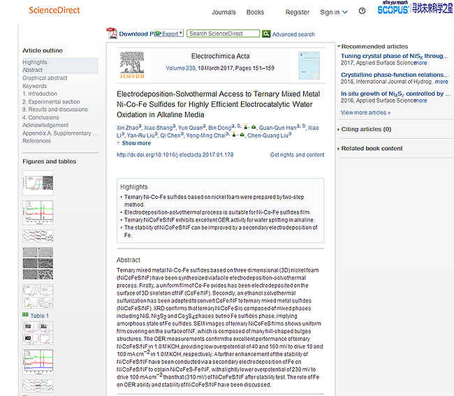 近日,公司化学工程公司2012级应用化学专业本科生赵欣的科研成果“Electrodeposition-Solvothermal Access to Ternary Mixed Metal Ni-Co-Fe Sulfides for Highly Efficient Electrocatalytic Water Oxidation in Alkaline Media”(电沉积结合溶剂热法制备三元过渡金属(Ni-Co-Fe)硫化物高效碱性水氧化电催化剂)在ElectrochimicaActa上在线发表。