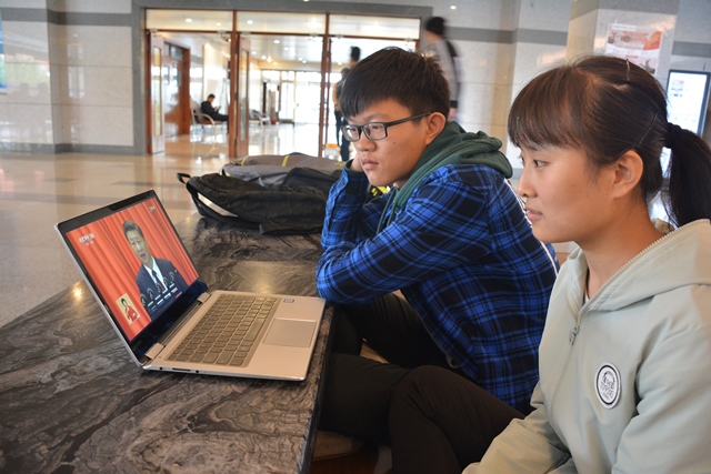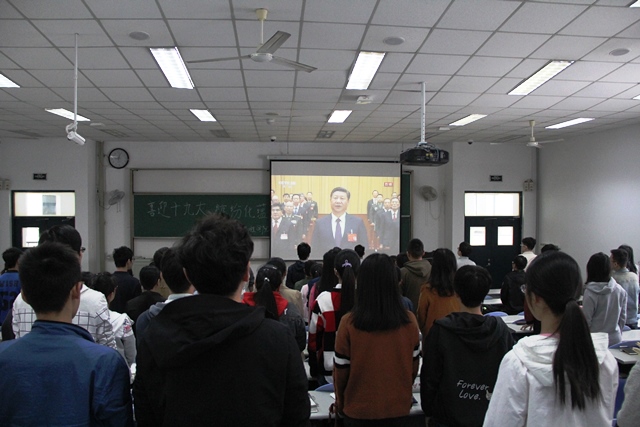 2014级本科生赵明超来自云南省曲靖市大山深处,几年来见证了家乡的巨大变化,他在观看直播后激动地说,十八大以来,党中央推行脱贫攻坚政策,给长期处于贫困状态中的乡亲带来了福音,家乡曾经的土基房变成了平房,曾经的黄土路变成了水泥路,水、电、网络样样都通到了村里,村里还建起了产业园,越来越多的年青人走上了工作岗位,越来越多的农产品走上了市场,在党和政府的带领下,全村人把脱贫事业干的红红火火,村里很多人不仅实现了脱贫,还实现了致富;十九大的召开,让我有了新的期待,也看到了新的希望,相信未来的五年,人民生活会更加幸福,整个国家也会更加繁荣富强。