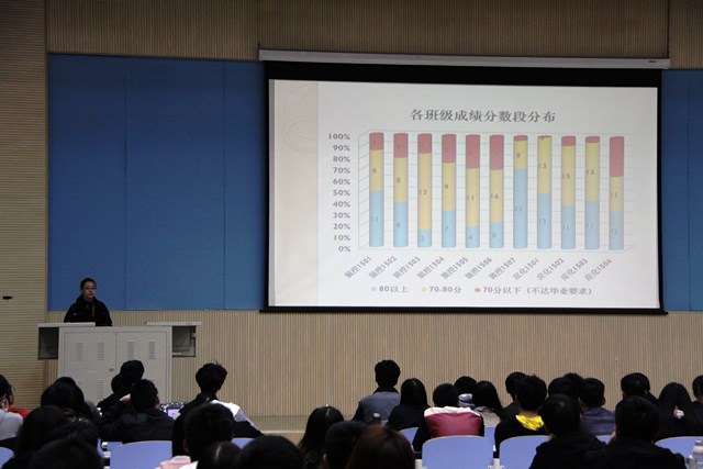 本次大会由辅导员薛慧主持。首先,辅导员通过各个班级优良率、及格率、四六级通过率、学业预警率等直观的数据、图表对上一学期的成绩进行了分析,深入总结了大二学年的学风情况,辅导员表示,希望同学们从上学年的成绩情况对以往的学习态度、学习方法、学习感悟做好总结。同时,辅导员从外出晚归、宿舍用电、校园贷、诚信考试等方面强调了安全、纪律问题。最后,辅导员将2017届毕业生的就业情况及2018届毕业生的保研情况进行了介绍,并就考研出国和就业选择等方面对员工的职业发展和选择进行了引导,她叮嘱同学们一这两届员工的情况作为参考,为自己的未来作出打算,提前准备。