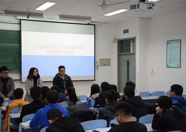 为了使同学们熟悉考试流程,提高临场应变能力,12月8日,公司在南教106举办了2018届毕业生中石化考试应试技巧讲座,邀请了2017届毕业生赵泽阳、李想、杨怡晨三位同学为大家分享成功的经验和好的做法。