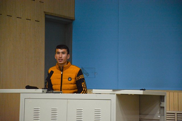 卡哈尔·热扎克作为十老员工标兵里唯一的一名少数民族员工,学习成绩非常优秀,专业排名第一,曾获得国家奖学金等多项奖励,他以“勇于改变”,“善于自制”,“勤于规划”,“乐于投入”,“敢于担当”为题讲述了他两年以来刻苦求学的奋斗历程。卡哈尔·热扎克从刚入学时生活、语言、学习方式等方面的不适应讲起,他指出虽然融入的过程存在很多的困难,但他一直坚信“大学不是你的终点,大学并不代表你的未来,你的未来是通过你自己的改变而创造出来的”。两年多来,他从小事做起,一点一滴追求进步,每天早睡早起、坚持自学、坚持体育锻炼,“不积跬步,无以至千里”,正是日常平凡的坚持成就了今天优秀的自己。他还将大学四年比做开车的过程,要有扎实的基础、熟练的方法和明确的目标。作为员工干部、排球队队长以及科技达人,他也从员工工作、学习投入以及科技活动方面给出了很多建议,他告诫大家要学会管理自己的时间,学习与工作要相平衡,要乐于投入、敢于担当。