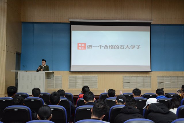 汪宇宸曾任公司员工会副主席,现已保送至华东理工大学。他在宣讲中将自己的成长归结为“以学习为中心,走全面发展之路”,宣讲内容分为两个部分,一是要明确方向——“你们以后想做什么?”二是要躬身实践——“做一个合格的石大学子”。汪宇辰首先强调了兴趣的重要性,他指出,“兴趣是最好的导师”,大家应该在自己兴趣的基础上选择主攻的专业和人生方向,大学期间的选择在很大程度上决定了人生未来的发展方向。接着,汪宇辰就如何躬身实践做一个合格的石大学子提出了自己的建议,他指出,优秀没有固定的标准,找准自己的目标和方向才是作为一个合格的石大学子应有的标准,“以学习为中心、走全面发展之路”也是每一名石大学子应该坚守的奋斗态度。在现场提问环节,汪宇宸根据的亲身经历和经验回答了关于如何获得推免生资格、如何高效学习英语以及如何正确看待个人期望与行业发展间的差距等同学们关心的问题。