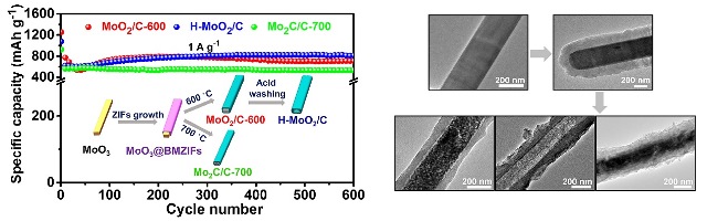 针对这一难题,吴明铂教授团队创新性地从金属有机框架材料(MOFs)出发,采用其与过渡金属氧化物原位自组装-热转化的技术策略,成功创制了多种具有优异储锂性能的钼基化合物/纳米碳复合材料。基于对MOFs在金属氧化物表面生长机理的深入探究,该团队利用表面活性剂等辅助手段精确调控了MOFs在金属氧化物表面的生长过程,实现了室温条件下对三氧化钼纳米棒前驱体的快速均匀包覆,并通过后续热处理等过程可控制备了具有分级多孔结构的氮掺杂纳米碳包覆多孔氧化钼/碳化钼纳米棒。具有多孔结构的活性物质能有效缓解储锂过程中的结构应力,极大提高了材料的使用寿命;均匀的纳米碳包覆则显著提高了材料的导电性。此外,壳层的金属有机框架材料可同时作为碳源前驱体和热解反应物,其在热解过程中的限域转化有效控制了活性物质的尺寸,赋予了复合材料优异的倍率特性。进一步动力学计算表明,复合材料电化学容量中赝电容贡献高,有望用于构筑高性能动力型锂离子电池。所制复合材料优异的电化学性能归因于合理的结构设计及不同组分间的协同耦合,为设计其他类型过渡金属化合物/碳基复合材料提供了新的设计思路。