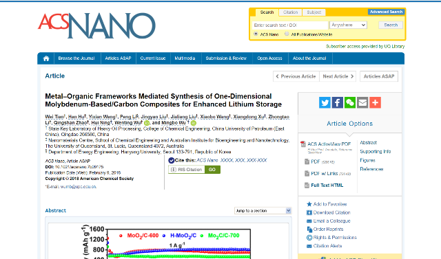 ACS Nano是化学和材料科学领域的顶级期刊之一,在国际上拥有广泛的影响力,其收录的文章主要分布在纳米科学与技术领域,对研究的原创性、结构的新颖性等有着极为严格的要求。2017年期刊的影响因子为13.942,在中科院JCR期刊分区中为1区TOP杂志。