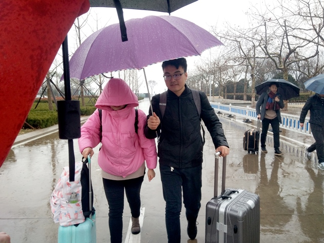 员工冒雨返校