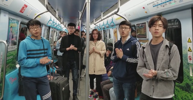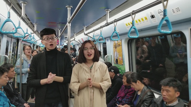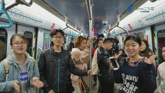 在人来人往的青岛站地铁站,3名同学依次从不同方位走出,共同演唱《歌唱祖国》,引来众多市民关注。在从青岛站到人民会堂站的地铁上,8名同学唱起歌曲《国家》,简单的歌词汇聚起浓浓的爱国深情,地铁乘客们也被感染,有的鼓掌,有的拿起手机记录。在汇泉广场站到中山公园站的地铁上,同学们再次合唱起《歌唱祖国》,激昂的旋律让人心潮澎湃,乘客们也加入到合唱中。