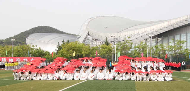 护旗手擎着鲜艳的五星红旗入场,来自青岛、东营两校区的28支代表队穿着整齐的服装,喊着嘹亮的口号,迈着矫健的步伐,依次走过主席台,接受检阅。在庄严的国歌声中,五星红旗冉冉升起。