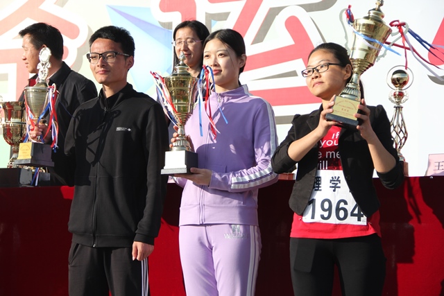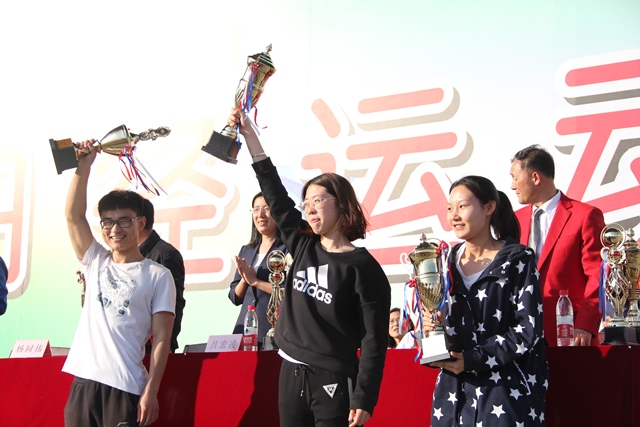 全运同学代表公司领员工甲组女子团体第一名奖杯(中间)
