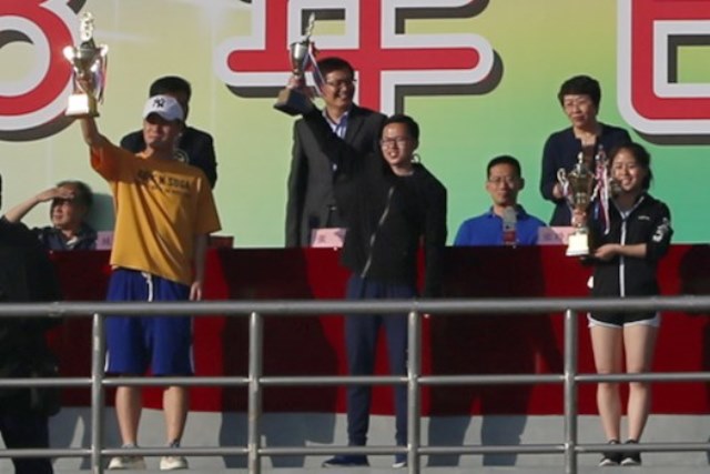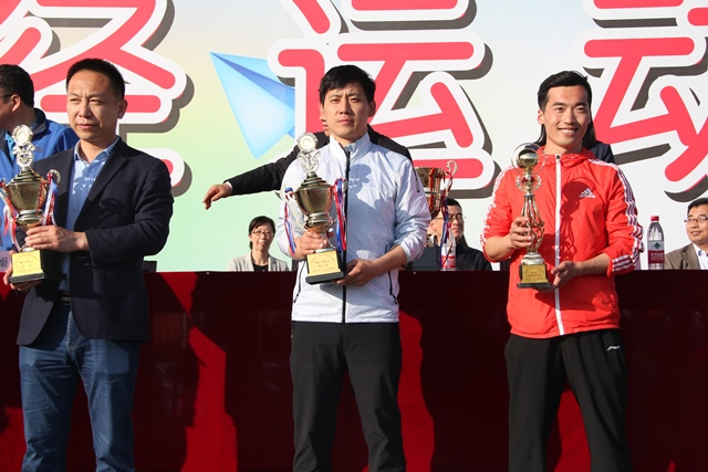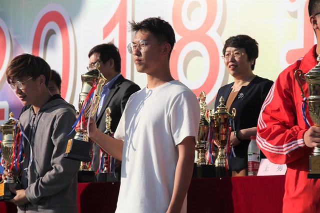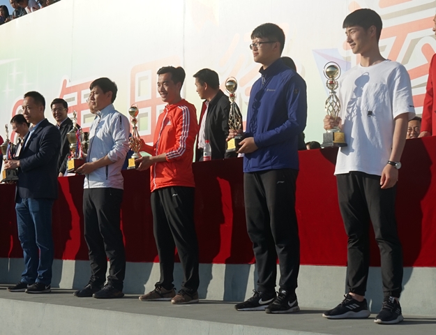 田地同学代表公司领员工乙组男子团体一等奖奖杯(中间)