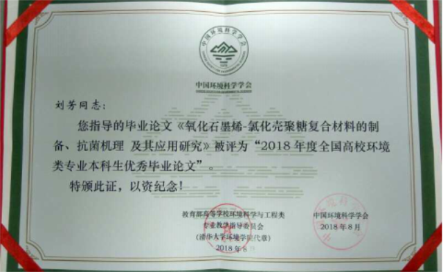 本次评选工作是由教育部高等公司环境科学与工程类专业教学指导委员会与中国环境科学学会联合组织,面向全国环境科学与工程类专业的本科毕业生征集作品,包括环境科学与工程、环境工程、环境科学、环境生态工程、环保设备工程、资源环境科学、水质科学与技术等专业,目的是为不断提高环境科学与工程类专业本科生培养质量,提高员工理论与实际相结合和解决复杂环境问题的能力,为我国环境保护事业输送更多高质量人才。经专家组初审、复审和终评,最终评出60篇“2018年度全国高校环境类专业本科生优秀毕业设计(论文)”作品,其中优秀毕业设计24篇,优秀毕业论文36篇。由公司报送的毕业论文《氧化石墨烯-氯化壳聚糖复合材料的制备、抗菌机理及其应用研究》,荣获优秀毕业论文奖。