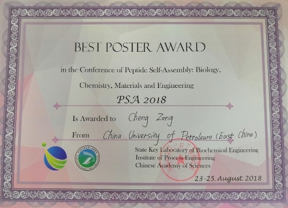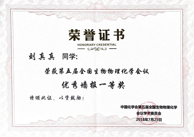 其中山西大学承办的“第五届全国生物物理化学会议主题包括生命现象的物理化学机制、物理化学在生命科学中的应用、生物物理化学新技术和新方法。中心研究生陆欣伟同学获得了优秀研究生报告奖,刘真真、徐宝美获得了优秀墙报奖。在由中科院过程工程研究所承办的主题为“Peptide Self-assembly: Biology, Chemistry, Materials and Engineering”的国际学术研讨会中师生们做了多场口头报告和墙报,宗城同学获得优秀墙报奖。