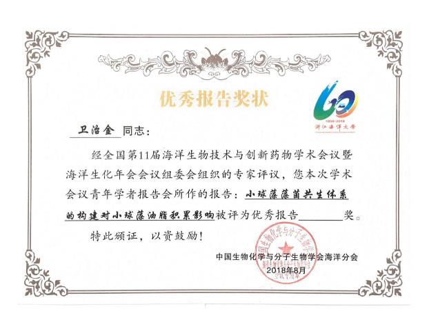 “全国第11届海洋生物技术与创新药物暨海洋生化学术会议”由中国生物化学与分子生物学会海洋生物化学与分子生物学分会发起,浙江海洋大学、海军军医大学、上海海洋大学、上海交通大学承办。旨在共同交流海洋生物技术领域的新成就和新进展,深入探讨十三五期间海洋生物技术领域的发展思路,为海洋生物技术工作者和企业界提供高水平的交流平台。卫治金同学在青年学者报告专场做报告并获得优秀报告奖。
