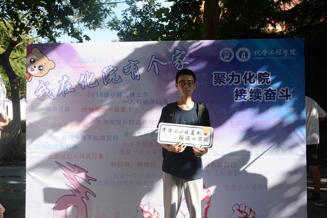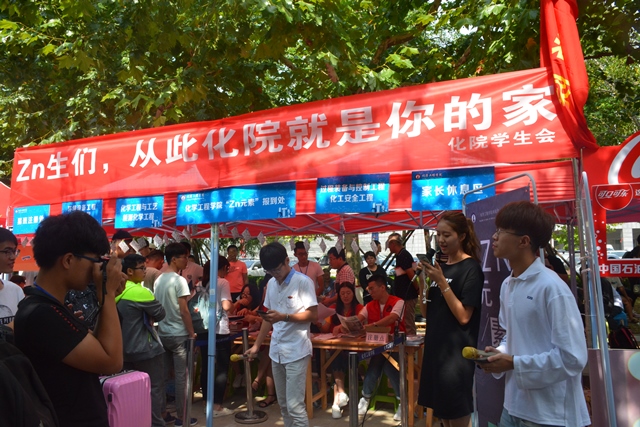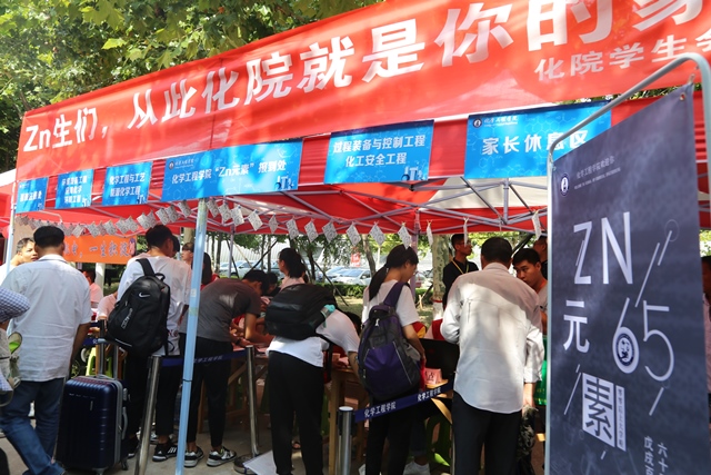 2018年恰逢公司65周年庆,公司用书籍摆出“65”的字样,营造书香氛围;“喜迎千禧少年,传承薪火化蕴”的对联表达了对新生的期望。优秀员工墙吸引了众多家长与新生驻足观看,通过优秀典型激励新生发奋图强,创造美好未来。公司还在迎新点设立了家长休息区,为家长答疑解惑,让其体会到公司的贴心。另外,公司迎新点突出“我在化院有个家”主题,设立迎新主题海报和主题合影墙,欢迎“Zn”元素来到化院这个大家庭,聚力化院,接续奋斗。