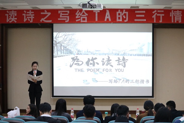 “人生苦短,而生命中的美好,却转瞬即逝。相遇是缘,缘起必灭,且行且珍惜……”11月29日,由化学工程公司员工会主办的“为你读诗”系列活动——写给“Ta”的三行情书决赛在西环301举行。辅导员买里旦、化院员工会主席袁俊聪、副主席姚莎莎、校员工会副主席姜菲、风雅诗社社长杨文举出席了此次活动。