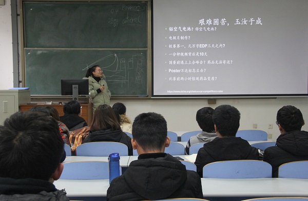 交流会现场,张嘉奇从创新、误差、规则等方面进行分享。就误差方面,张嘉奇分享了解决误差的两个基本思路:保证电池稳定,进行精确控制和进行多次试验测试。随后,张嘉奇提到在chem-e-car世界竞赛中某参赛队因主办方未能提供其所需原料,从而导致他们团队设计的化工小车未能正常启动,因此张嘉奇强调化工小车体系应该化繁为简,原料简单易得。宋雨柔提出本次参赛队小车存在连接线乱导致内阻较大等问题,此类细节造成小车无法正常启动。随后,宋雨柔分享了他们团队前去美国参加chem-e-car世界竞赛看到的外国参赛队设计的化工小车,相比国内以锌、铝、箔等设计的普通化学动力,外国有更多的气动、有机电池等创新化学动力。陈思远就chem-e-car世界竞赛中某些设计精美的化工小车外型进行展示,希望本次参赛队设计一个精美的小车外观。陈思远同时分享了他们队在美国生活的一些经历及经验。交流会最后,化工系金鑫老师说明了国赛的具体安排,建议参赛队利用寒假时间就开始进行参赛准备。
