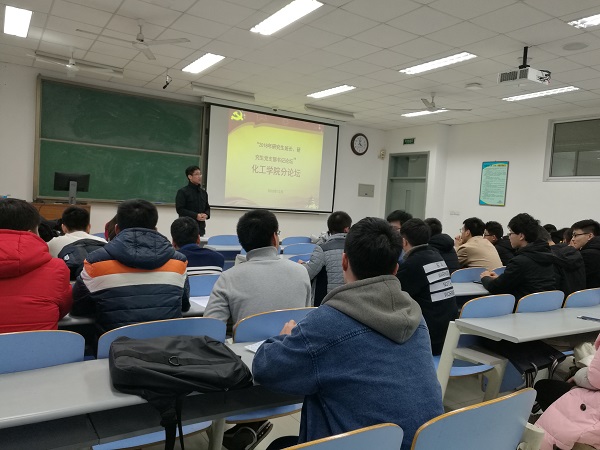 12月13日, 2018年研究生骨干培训班全体成员在南教楼219多媒体教室召开“2018年研究生班长、研究生党支部书记论坛”活动化工公司分论坛。此次活动由化工公司研究生党建中心主办,党建中心书记刘彩主持,研究生辅导员郭孟出席。