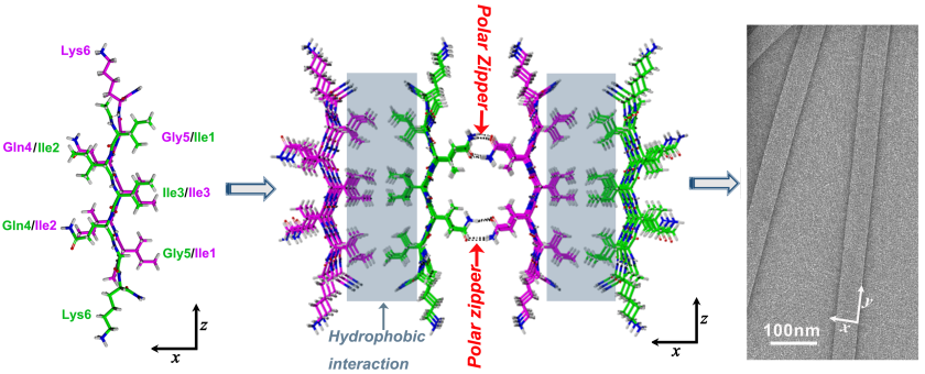 新颖组装基元的设计、组装过程和结构的动态调控、生物学功能组装体系的构筑是超分子化学和自组装领域研究的核心问题。生物界面与材料团队设计了系列小分子短肽,通过原子力显微镜、小角中子散射、固体核磁等技术研究了其自组装过程和结构。生物界面与材料团队研究发现极性氨基酸拉链结构也可以在β折叠片之间形成,这是一种新型的超二级结构。相对于非极性的亮氨酸拉链,极性氨基酸拉链比较少见。