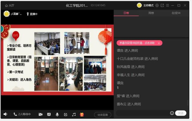 1月18日中午,化学工程公司2018级召开网络家长会,旨在促进家校联系,使员工家长了解子女学业及在校表现,了解公司、公司发展情况。会议由2018级辅导员刘伟主持,兼职辅导员王玉娟及百余名家长参加。