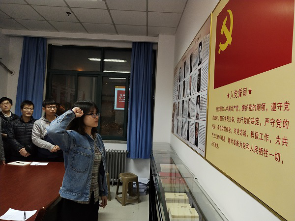 入党积极分子在汇报完自己近期的表现和自己对于“如何以党员的身份严格要求自己”的详细阐述之后,全体党员为朱媚同志过“政治生日”,今天是朱媚同志入党3周年纪念日,全体党员与朱媚同志重温入党誓词,完毕后朱媚同志感慨万千:“时隔三年又一次面对党旗宣誓,再一次强化了自己的党员身份,明确党员义务,要充分发挥自己的党员先进性。”