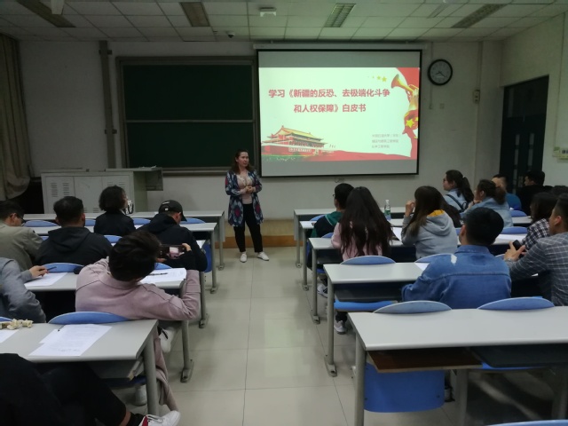 环境1502班吐尔孙阿依也跟与会同学分享了自己的学习感受,她谈到:“白皮书中一系列详实的数据、一件件案件、一个个务实有效的举措,充分彰显了新疆反恐、去极端化是正义的斗争,充分说明了中国政府反恐怖主义、捍卫人权的坚定立场。而我们作为新时代的老员工,要正确认识新疆的历史,要通过努力学习来更好的维护民族团结,维护新疆的社会稳定。正如习大大在五四运动100周年纪念日的讲话中所说,一代人有一-代人的长征,一代人有一-代人的担当。作为新时代的青年,我们要牢记身上的重担,为建设大美新疆做出贡献”。