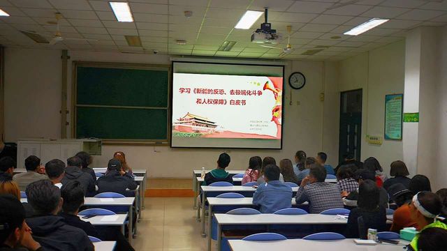 随后李老师带领同学们重点学习了《新疆的反恐、去极端化斗争与人权保障》白皮书的主要内容。白皮书从新疆是中国领土不可分割的一部分、恐怖主义和极端主义在新疆的由来、暴力恐怖和宗教极端行为严重践踏人权、依法严厉打击恐怖主义和极端主义等几个方面内容,详细介绍了我国新疆的反恐、去极端化与人权保障工作。李老师还结合新疆当前社会现状,强调开展反恐怖主义与反极端化斗争的重要意义,并要求同学们在会后认真学习、通读白皮书,认真思考其中内容,坚决抵制和防范“三股势力”向校园渗透。
