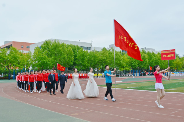 护旗手擎着鲜艳的五星红旗入场,来自青岛、东营两校区的28支代表队穿着整齐的服装,喊着嘹亮的口号,迈着矫健的步伐,依次走过主席台,接受检阅。