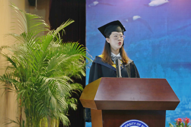 仪式最后,获得硕士学位的优秀毕业生代表刘鑫鑫、获得学士学位的优秀毕业生代表全运分别发言,表达他们对母校的不舍和感恩。
