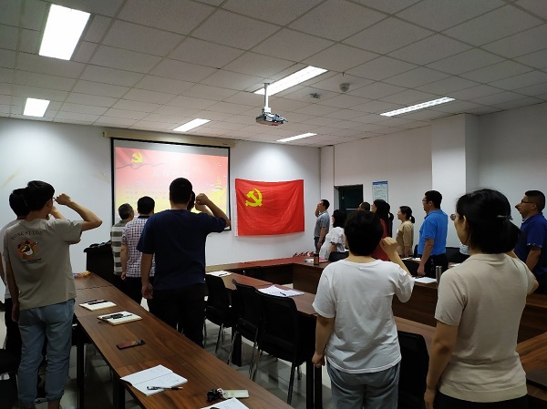 最后,大家集体起立,佩戴党徽,举起右拳,面向党旗重温入党誓词,重温入党时的决心和理想,一句句铿锵有力的入党誓词在会议室回响,表达了大家不忘初心、牢记使命的信念和决心。