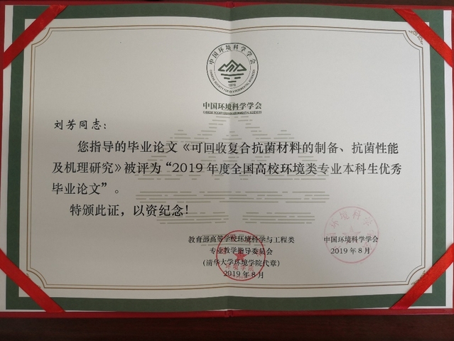 近日,教育部高等公司环境科学与工程类专业教学指导委员会下发《2019年度全国高校环境类专业本科生优秀毕业设计(论文)公告》。由公司环境与安全工程系刘芳教授指导、2015级环境工程专业本科生赵梦菲的本科毕业论文《可回收复合抗菌材料的制备、抗菌性能及机理研究》,被评为“2019年度全国高校环境类专业本科生优秀毕业论文” ,这是公司第三次获得此荣誉。