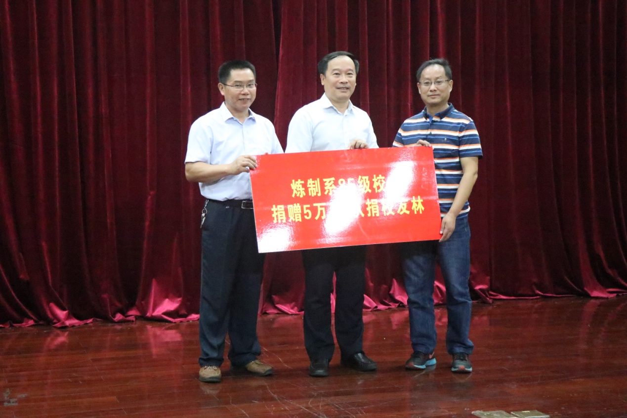 姚军代表公司接受炼制系85级员工的捐赠,并为员工颁发了捐赠证书。炼制系85级员工感恩母校,向母校捐赠5万元认捐员工林。员工们十分重视员工林的认捐,在校园里精心选取一片树林,并特别设计了员工林的立牌。