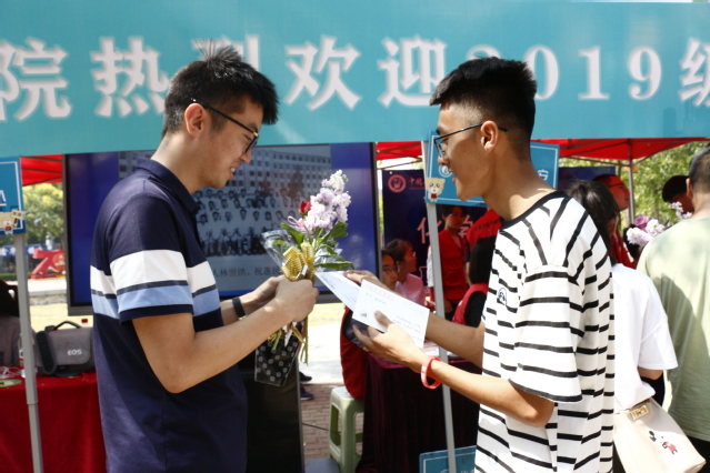 公司领导前往迎新点看望新生,班主任和辅导员在迎新点值班为新生答疑解惑,让2019级新生倍感温暖。2019级新生在迎新点向辅导员王兆兴老师和薛慧老师献上了凝聚着浓厚师生情的花朵,并将手写的便签送给了辅导员老师。师生有说有笑,场面温馨感人。