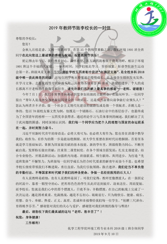 环境1801班全体同学通过一封长信给联系班级的副董事长李兆敏老师送上了教师节祝福,也将班级全体同学“争做经世致用石大人”的决心凝集到了信纸上。
