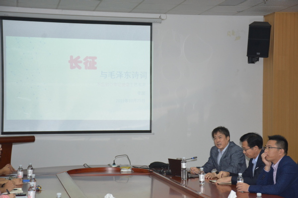 10月21日晚,公司党委书记李国在工科A121报告厅为师生讲授题为“不忘初心、牢记使命--长征与毛泽东诗词”的专题党课,公司主题教育第二指导成员杨武成、杨卫生到场指导,公司机关党支部、工业催化第一员工党支部全体党员同志聆听了党课。