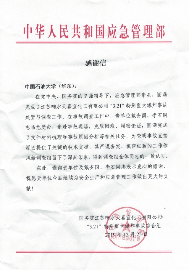 2019年3月21日14时48分许,江苏省盐城市响水县生态化工园区天嘉宜化工有限公司(以下简称天嘉宜公司)发生特别重大爆炸事故,造成78人死亡、76人重伤,640人住院治疗,直接经济损失198635.07万元。事故发生后,公司化学工程公司李石副教授和安全环保与节能技术中心戴安国工程师,作为应急处置技术专家立即赶赴事故现场,参与事故调查工作,为事故原因调查分析、事故应急处置等方面提供技术支持,得到了事故调查组的高度认可。