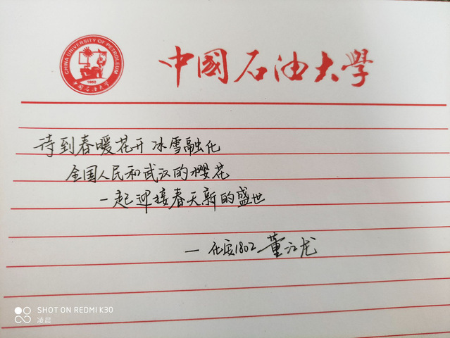 “本次团日活动使我对此次疫情有了更深入的体会,最美逆行者钟南山院士为天地立心,为生民立命,大医精诚,国士无双。天佑中华,钟老先生定会平安归来,武汉的赏樱人也能如约而至,中国加油!武汉加油!”化工安全1802班团支书王晴这样说道。