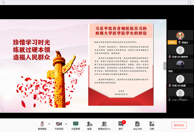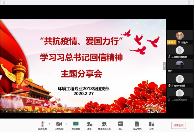 自肺炎疫情爆发以来,公司各级组织高度重视防疫工作。为助力国家战胜疫情,增强疫情防控意识,提升战胜疫情的信心,进一步做好疫情防控工作,2月27日,环境1801团支部、1802团支部开展了“共抗疫情,爱国力行”学习习近平总书记回信精神线上主题分享会。本次会议由环境1801团支部书记纪欣蕾主持,环境工程专业2018级全体员工参加。