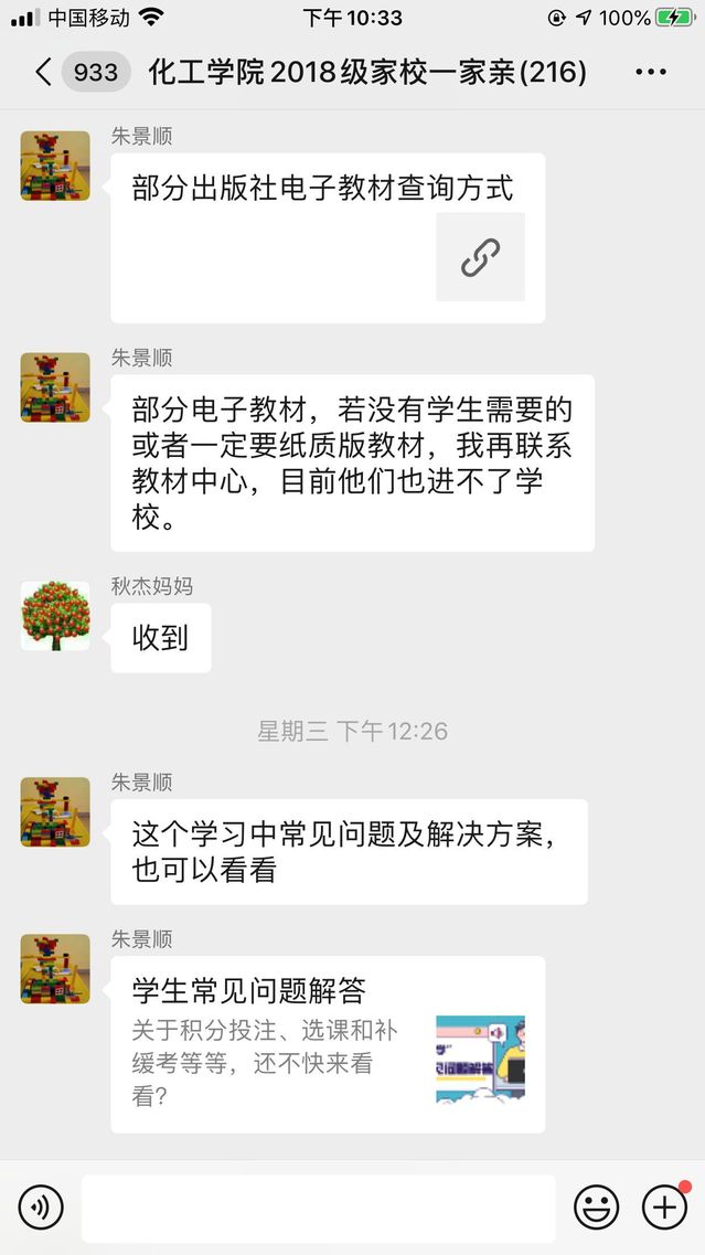 家校合作促教育。辅导员积极通过QQ群、微信群、电话等方式与员工家长进行沟通联系,传达公司关于线上教育的各项通知及要求,搞好“家校教育大合唱”,让家长更多地参与到课堂监督上来,保证员工居家上课效果和听课质量。
