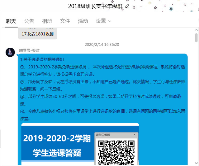 线上倡议促学风。2018级年级工作组向全体同学发出线上学风建设的倡议:值此特殊时期,作为新时代的青年员工,同学们应加强自我管理,养成良好习惯;端正学习态度,严守教学纪律;带头树立榜样,携手共克难关;厘清重点难点,集中统一攻关。线上学风建设从各个方面对同学们进行激励与引导,为年级优良学风建设打下了坚实的基础。