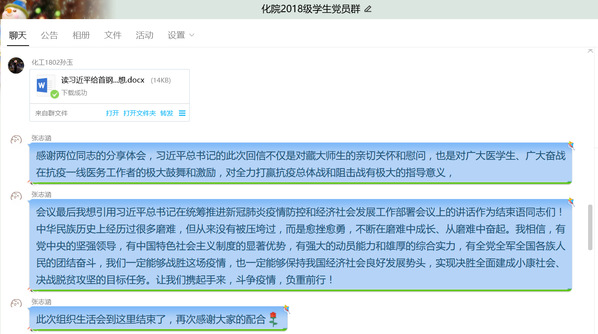 2月27日,2018级员工党员线上开展“斗争疫情,负重前行”专题学习会,通过介绍分享疫情现状、预防措施,鼓励大家在加强自我防护的同时积极向同学、家人宣传预防举措。与会员工党员认真学习了总书记回信和相关文件,并进行了疫情期间如何发挥好基层党组织战斗堡垒作用、员工党员先锋模范作用等话题的热烈讨论。2018级员工党员任浩飞在会议中说道:“这篇回信体现了习近平总书记对少数民族群众和医务工作者的关心与关爱,同时也激励我们广大青年以抗击疫情的白衣天使的榜样,不断努力奋斗,练就过硬本领,为祖国人民做贡献。”