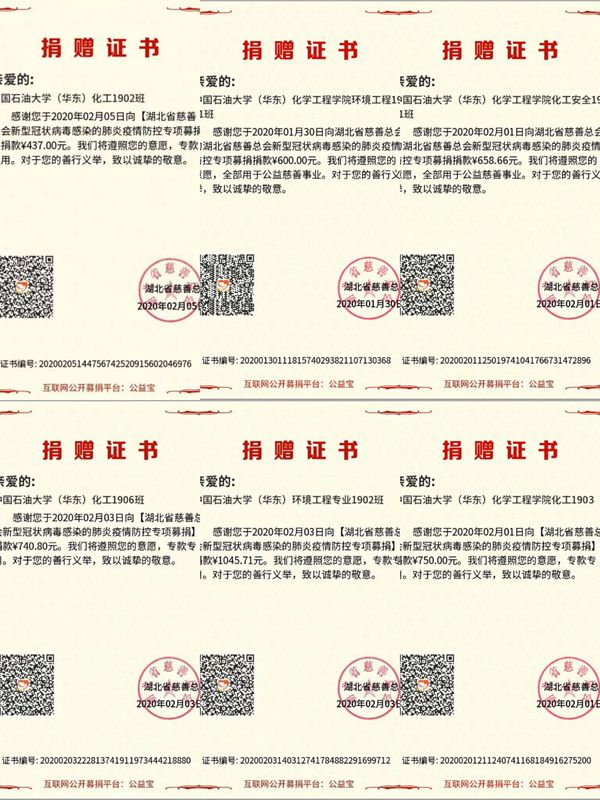 化院19级各班捐赠证书
