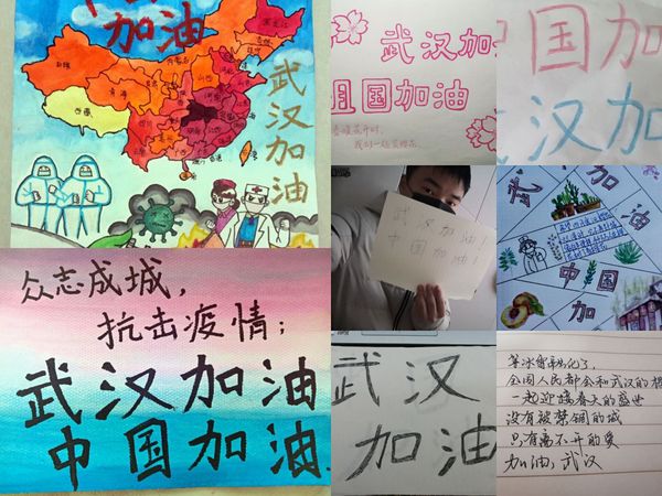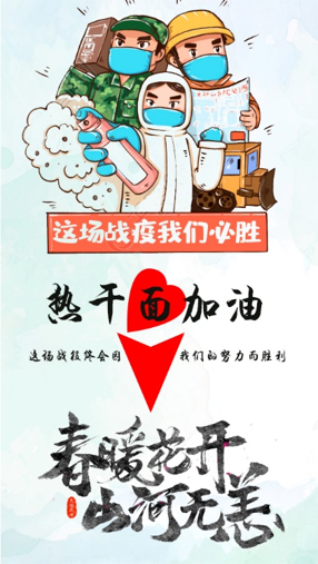 在特殊时期下,环境1901、1902班等班级自觉发起为武汉捐款活动。班内捐款虽无强制要求,但员工积极响应,纷纷进行捐款。同时,化安1901、化工1902班分别组织班内员工开展“为武汉加油”文艺作品创作活动,鼓励员工以手写、手绘等形式表达对武汉的祝福。其中,化安1901郭恒旭同学创作了“春暖花开,山河无恙”主题海报。海报中绘出了抗击疫情的三大主力军:医生、工人和军人。医生冲在抗疫一线,而军人维护秩序、工人建造医疗场地辅助抗疫,而“热干面”代表了武汉,表达了对武汉的祝福。