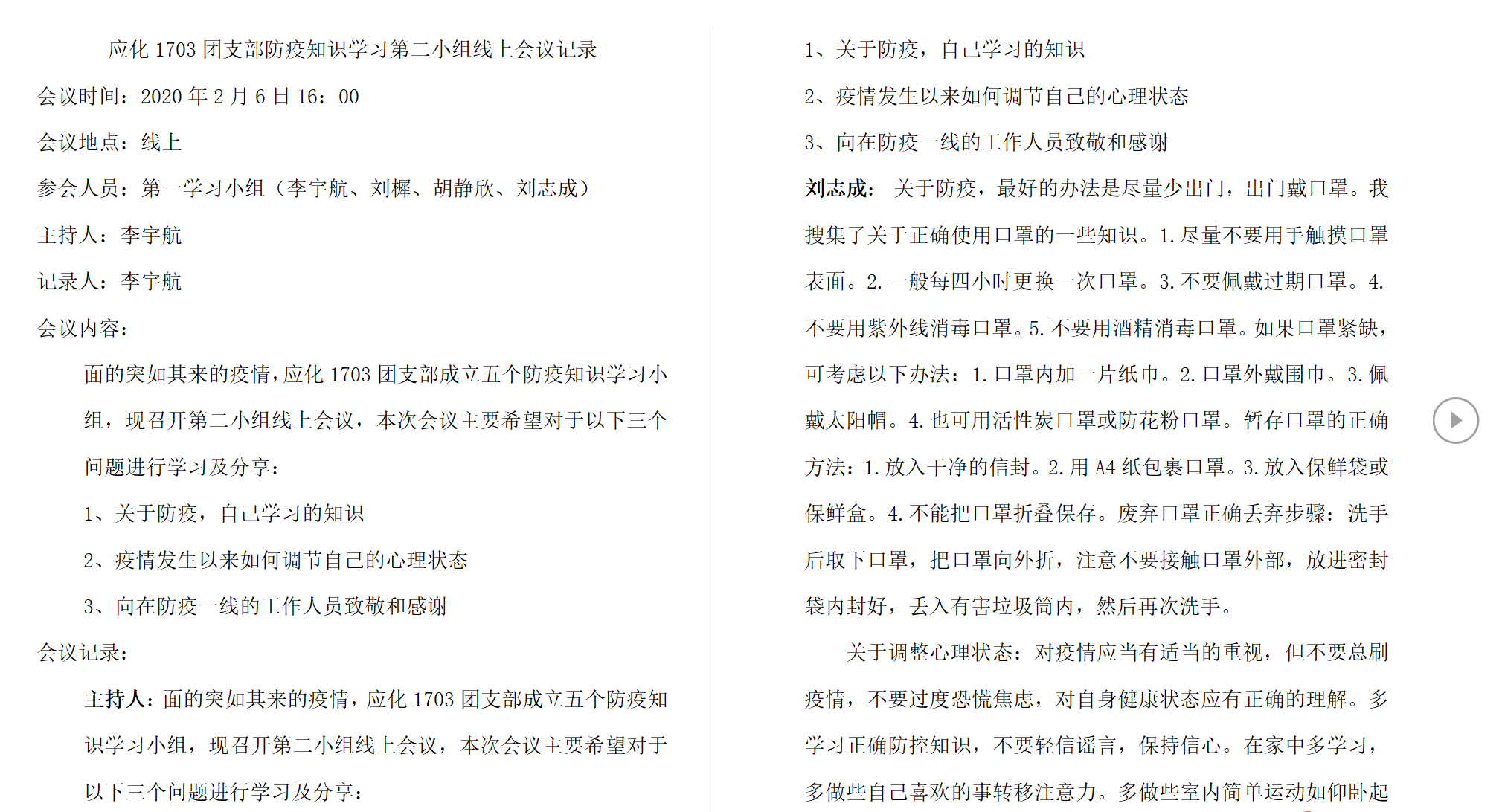 应化1703团支部将团员分成五个小组进行线上会议成立五个防疫知识学习小组,他们就“学习防疫知识、调整自己的心态、向一线工作人员致敬”三个主题进行了讨论。团支书张啸说到:“通过这次特别的团日活动,支部成员们不仅学习到正确的防疫知识得以保护自己和家人的健康、积极向身边的人民群众传播防疫知识、破除谣言。还通过视频、海报、手绘等方式对一线防疫工作人员致敬,充分的展现了当代老员工的风采,为疫情防控尽了一份力。”