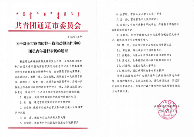 凝心聚力,共克时艰。3月4日,共青团通辽市委员会发布《关于对全市疫情防控一线主动担当作为的团员青年进行表扬的通报》,公司2018级应用化学专业4班员工金智颖受表扬。