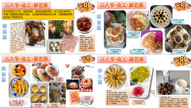公司各单位在积极组织女教职工参与校工会“书香三八节”读书活动的同时,结合疫情防控工作开展妇女节庆祝活动。化学工程系开展居家厨艺展示活动,老师们分享家常菜的做法和心得,在交流健康营养的同时充实了家庭生活。化工实验教学中心举办了“三八节”美食云享会,女老师们纷纷拿出“拿手好菜”,在厨艺大比拼中欢度节日。
