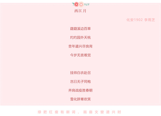春风徐来,芳华盛开。化院师生以多样的活动为女性教职工和员工庆祝妇女节,不仅展现了化院师生对女性的尊重,也表达了大家对女性的美好祝愿,希望公司所有女性都能——坚守梦田种桃种李种春风,追逐梦想开尽梨花春又来!