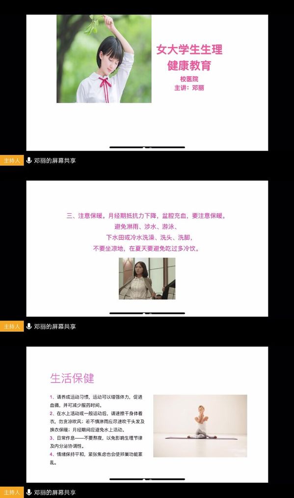 邓丽大夫结合案例分析,从“女性生殖健康”“生理周期与生理期注意事项”“正确的避孕知识”“女性常见妇科病的预防”这四个方面向同学们讲解了女性相关的生理健康,解答了很多困扰女老员工的问题,在互动环节女老员工们根据自身的情况提出自己的问题,老师也一一详尽的进行了解答。邓老师鼓励同学们健康生活,保护好自己,引导同学们树立自尊、自爱、自重的恋爱价值观,有一个积极健康的心态。邓老师还强调在疫情期间要注意个人卫生,还给同学们分享了一些有关防疫的技巧与知识。讲座结束,环境1702邵琰蕾表示“从这次讲座中,我从专业的角度了解了女性生理健康知识,从而也能够更好的保护自己。”