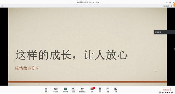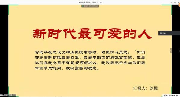 在团支部书记张啸的有序组织下,首先进行的是疫情中的故事分享环节,支部成员王艺家、刘樨分享了她们所获知的疫情之中感人的小故事,向奋斗在一线的医护人员致以敬意。之后,全体支部成员观看了视频《我们的雷锋》和《武汉:我的抗“疫”日记》,支部成员们了解雷锋的生平和当前武汉的生活。随后,班主任王晓娟发言,她强调:“疫情当前,作为员工更要努力学习,将来成为祖国的栋梁之材。”张啸就会议内容提出问题,引发支部成员思考: 90后已经逐渐担起国家重任,当代青年要怎么做才能跟好前辈的脚步,走好接下来的路?支部成员对此纷纷发表自己的看法。其中,李宇航说道:“科技创新的比拼即人才创新的比拼,老一辈为青年树立榜样,青年们也应当紧跟脚步,不忘初心,砥砺前行。”会议的最后,张啸进行总结,并提醒支部成员做好防护工作、跟上网课进度、认真阅读公司下发的通知并遵守规定。