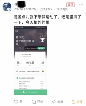 自新型冠状病毒感染的肺炎疫情蔓延开来,大家越来越明白强健体魄、提高免疫力的重要性,化工1703班杜波波同学表示,“居家运动打卡的活动让我在家的生活逐渐规律。运动不仅能让我们有一个更加饱满的生活状态,同时运动完成之后的满足感能化解生活不好的情绪。”