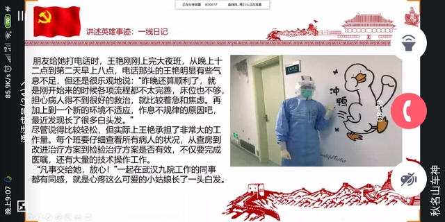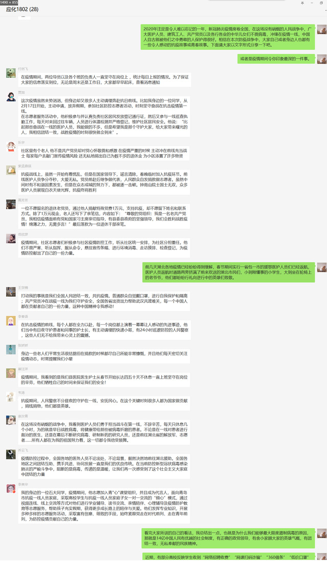 各团支部通过不同的形式向员工讲述了发生在疫情期间令人动容的故事,向员工传播正能量,引导各支部员工感受故事背后的精神。环境1801团支部通过播放员工自制短视频、讲述化工公司师生抗疫故事、朗诵《给北大90后党员援鄂医疗团队的回信》的方式,学习青年人不畏艰险、冲锋在前、舍生忘死的精神品质。化工安全1801与化工1804团支部通过图片、文字、视频等形式展示了全国上下共抗疫情的温馨时刻。支部员工共同探讨,感悟一方有难、八方支援的“中国热度”。应化1803团支部分享护士王艳、司机冯小波的感人故事,让员工感受到平凡中的不平凡,感受一个人的担当与责任。正如应化1802班班长国浩在分享会中所说:“正是因为14亿中国人民有优越的社会制度,有正确的政党领导,有舍小家顾大家的英雄气概,有团结一致、无私奉献的民族精神,才使得我国能够最大程度的遏制疫情。”