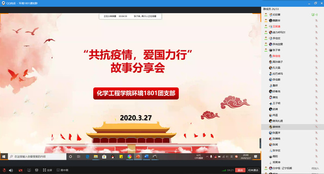 为了帮助同学们更好地了解抗疫期间那些感人肺腑的事迹,引导青年员工向疫情期间所涌现的榜样先锋学习,3月23日-27日,2018级各团支部召开“共抗疫情、爱国力行”专题故事分享会。